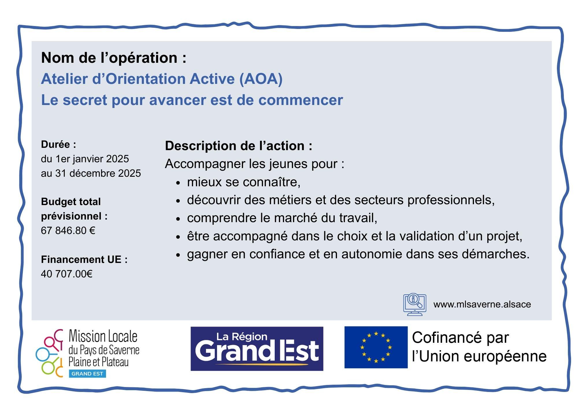 La Mission Locale du Pays de Saverne, Plaine et Plateau a poursuivi en 2025 « l’Atelier d’Orientation Active » (AOA), une action soutenue en 2025 par la Région Grand Est et l’Union Européenne au travers du FSE+